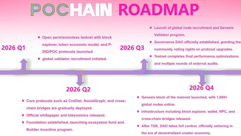 • POChain: A fully sovereign AIGC-focused Layer 1 blockchain for Web3 creators, EVM-compatible with BNB Chain, designed as next-generation infrastructure for AI-native content creation and value settlement. According to the roadmap, the POChain ecosystem will progressively launch the following products in 2026: