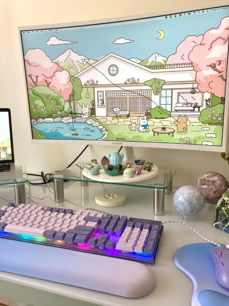 I also bought 2 glass monitor stands for my Samsung screen and Mac laptop, so both screens are at eye level, and I’m not staring down at any screens. For fun, I bought a light-up keyboard and mouse because I loved the colors. I also bought an ergonomic wrist rest (I can’t find the exact set I bought, but I personally think this set is better anyway).