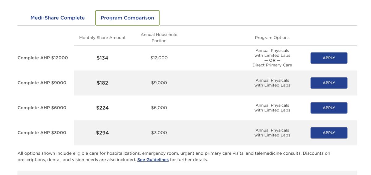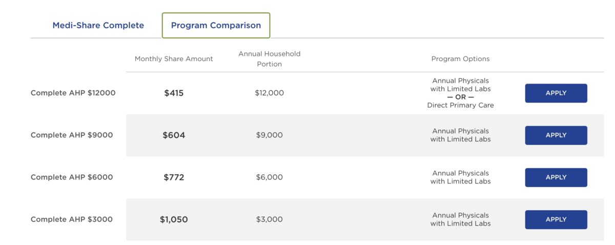 Here is an example of some of the plan options Medi-Share has, along with their monthly amounts.