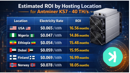 When hosting your Antminer KS7 with OneMiners, your return on investment varies based on electricity rates across global data centers. In the USA 🇺🇸, miners can expect an estimated ROI of 16.56 months at a cost of $0.065/kWh, while Nigeria 🇳🇬 offers one of the fastest returns at just 14.86 months thanks to its competitive $0.047/kWh rate. Ethiopia 🇪🇹 follows closely with 15.48 months at $0.054/kWh, and Dubai 🇦🇪 provides strong performance with an ROI of 15.95 months at $0.059/kWh. For European miners, Finland 🇫🇮 and Norway 🇳🇴 offer stable infrastructures with ROIs of 16.99 months and 18.05 months, respectively, balancing security and sustainability within favorable mining climates.